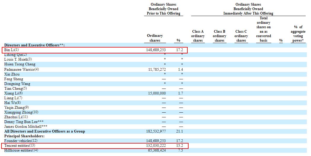 根据招股书披露,蔚来创始人李斌持股17.2%,腾讯持股15.2%,高瓴资本持股7.5%,车和家创始人李想持股1.7%,蔚来北美CEO Padmasree Warrior持股1.4%。