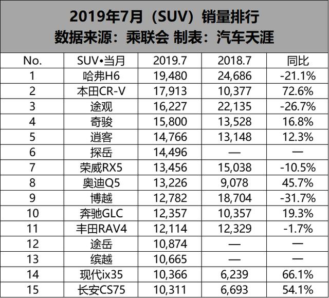 阅历了6月张狂促销,7月的SUV商场逐步回归理性。7月SUV销量榜与6月有了不小的改变。哈弗H6 7月销量19480辆,从途观手里从头夺回第一的方位。东本的当家花旦CR-V紧随其后,7月出售22242辆,同比上涨了72.6%,排在第二。途观7月出售16227辆,同比下滑26.7%,排在第三。