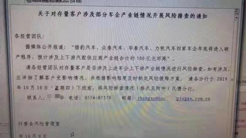 该告诉内容显现称,“据媒体揭露报导猎豹轿车、众泰轿车、华泰轿车和力帆轿车四家车企年末将进入破产程序,估计触及上下游汽配供货商产业链算计约500亿元坏账,因而要求其各运营团队对存量客户是否触及上述车企上下游产业链状况进行危险排查。”